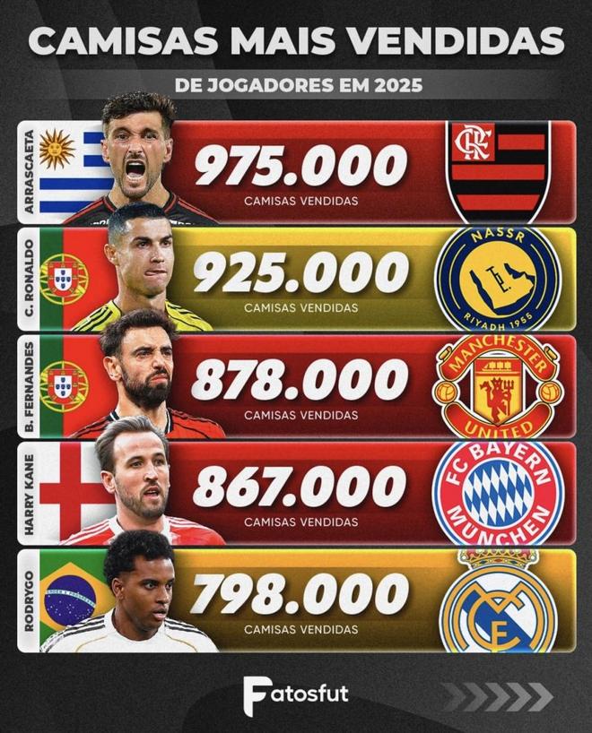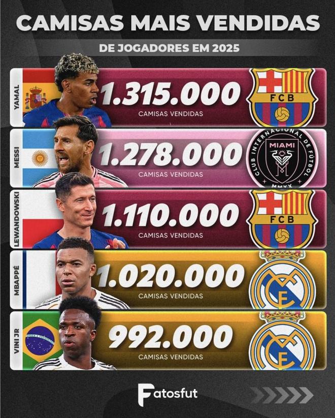 从标题看,这组数据被定义为“2025年球衣销量最多的球员”,但画面上并没有细分是按自然年统计,还是按某个赛季、截止到哪一天来算,所以更适合当作“2025年阶段性销量排行”去理解,而不是一个有精确起止日期的官方终极榜单。在这样的前提下,亚马尔排第1、梅西第2、C罗跌到第7,其实反映的就是当前这一阶段球迷消费热度的排序:谁正当红、谁有新故事、谁的球衣最容易在全球各大渠道被看见并被买走。